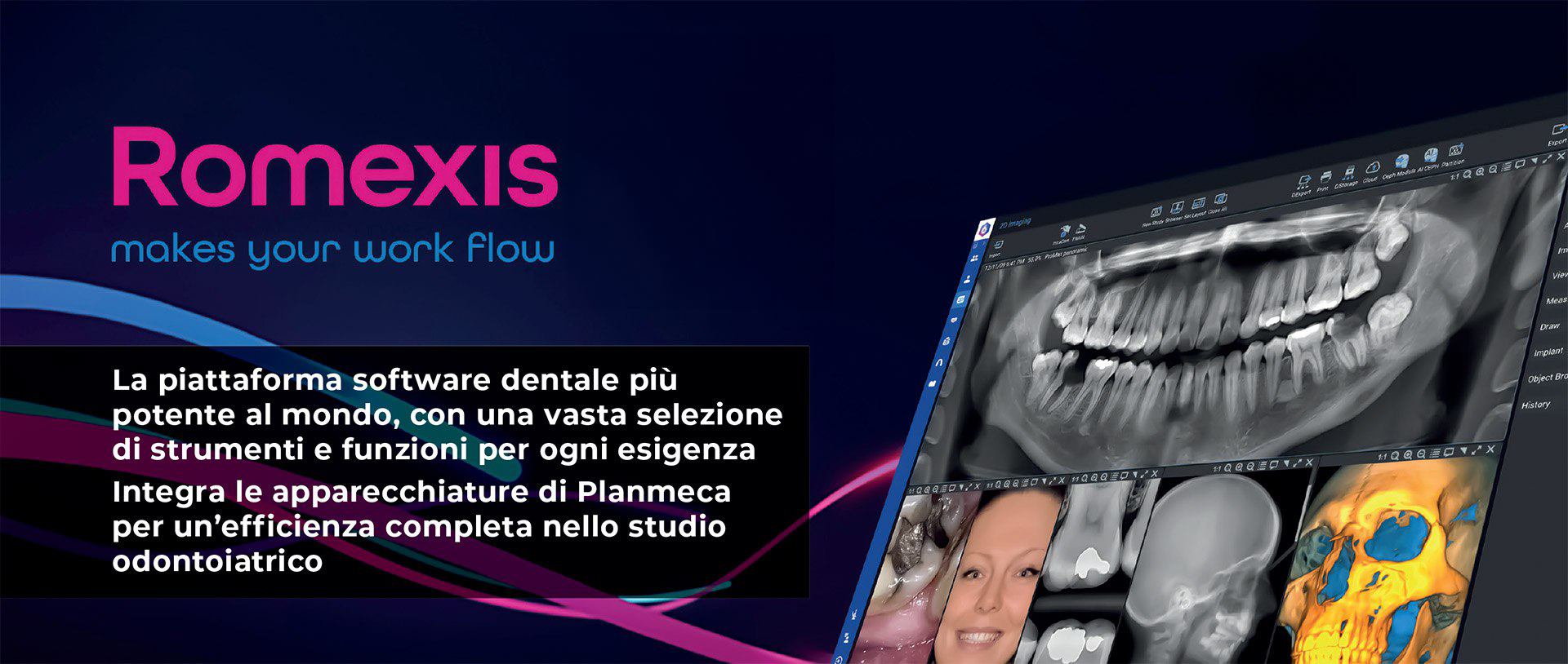 Romexis è un software versatile che gestisce immagini 2D e 3D, casi CAD/CAM e altro ancora in un unico database. Gli strumenti specializzati, il monitoraggio in tempo reale e la connettività con le apparecchiature di Planmeca ottimizzano l’efficienza di Romexis.