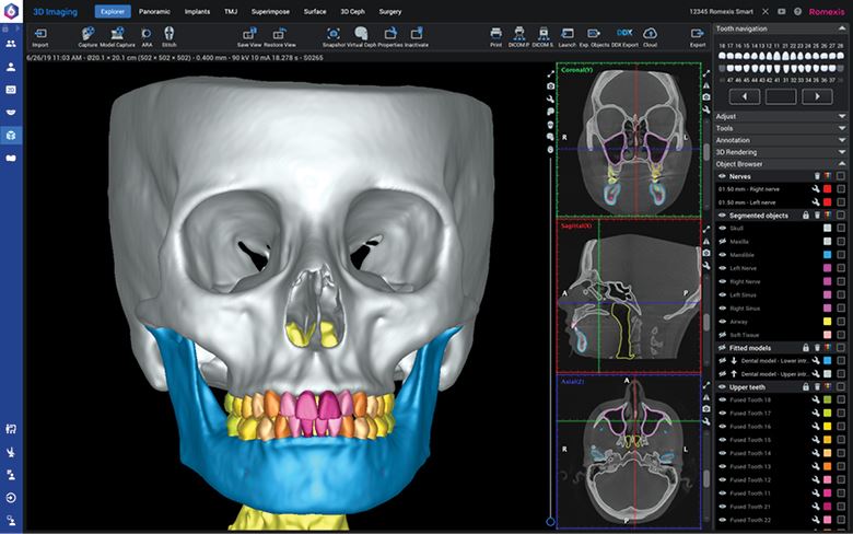 Romexis® Smart è una funzionalità opzionale disponibile per il modulo di imaging 3D Romexis. Segmenta e riconosce automaticamente anatomie come il cranio, i tessuti molli, i denti, i nervi, le arcate, le vie aeree e i seni paranasali. Con l’introduzione di questa nuova funzionalità, l’utilizzo del software risulta ancora più agevole e rapido, e la visualizzazione delle anatomie lo rende un ottimo strumento per la comunicazione con i pazienti.
