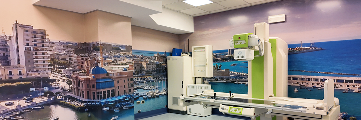 La sala diagnostica, con le sue pareti colorate, accoglie il paziente in una dimensione familiare, colorata e positiva, riducendo disagio e stress dovuto all’esame diagnostico, rassicurandolo e rilassandolo.